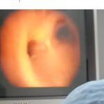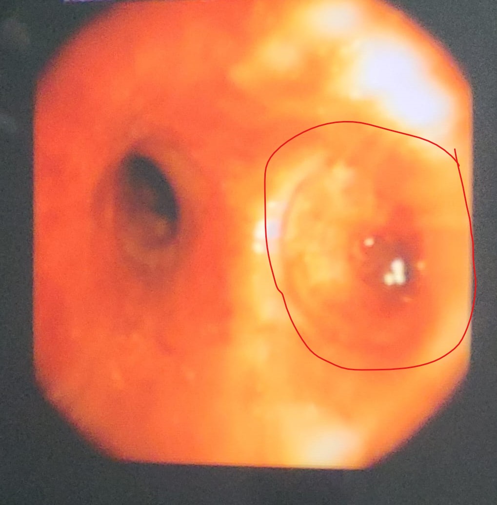 La imagen siguiente muestra la división de los bronquios, en una Fibrobroncoscopia y también se observa en un segmento del bronquio, la alteración que puede darse en el cáncer.